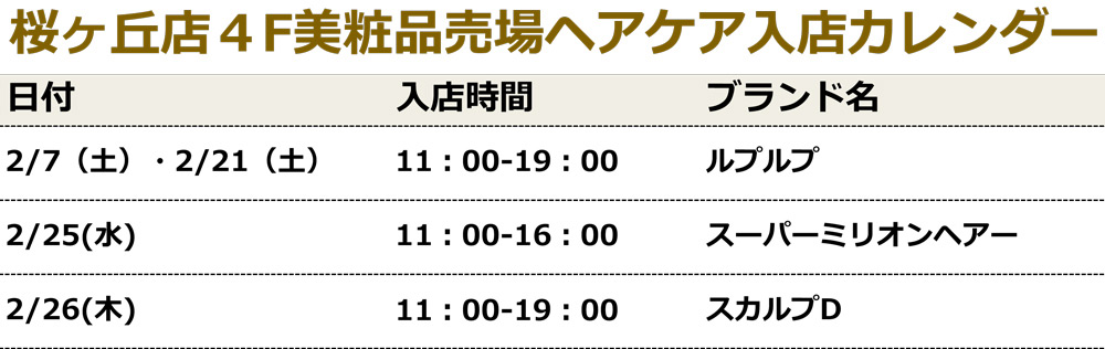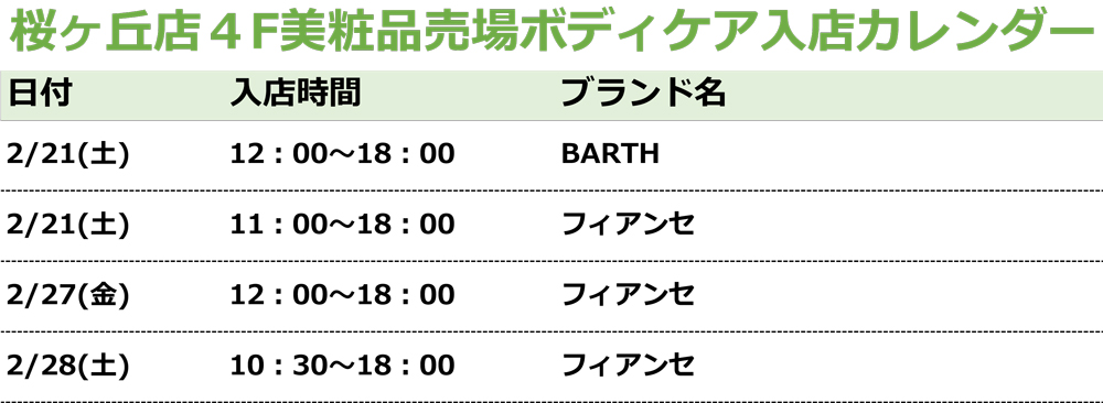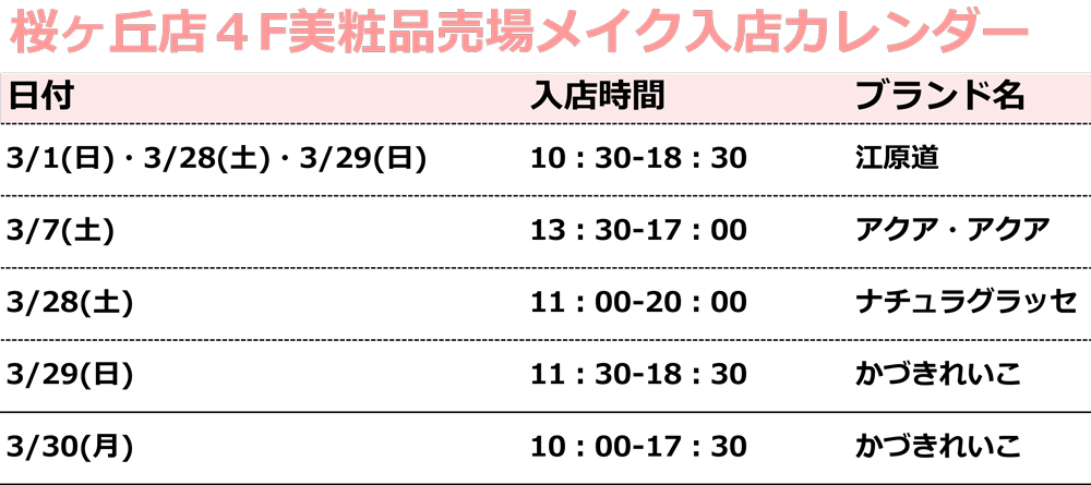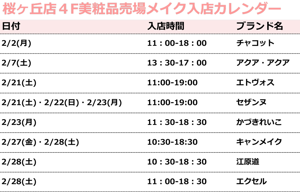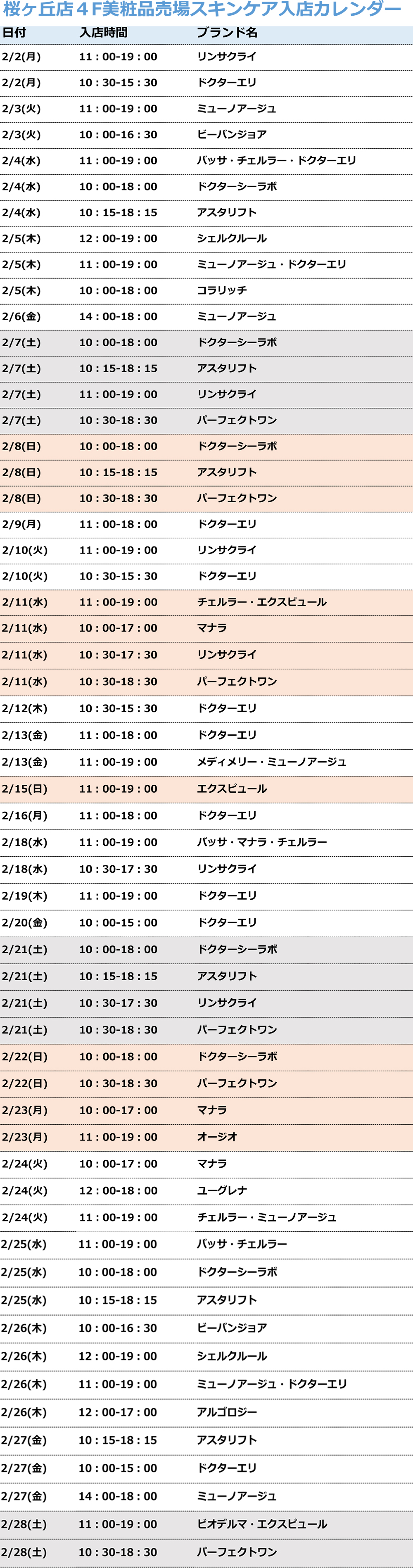聖蹟桜ヶ丘店美粧品売場 専門スタッフ入店カレンダー