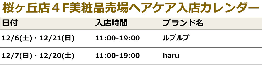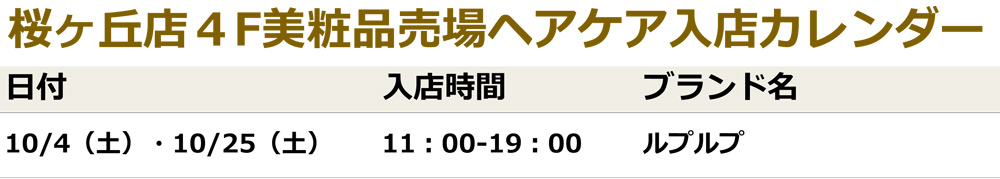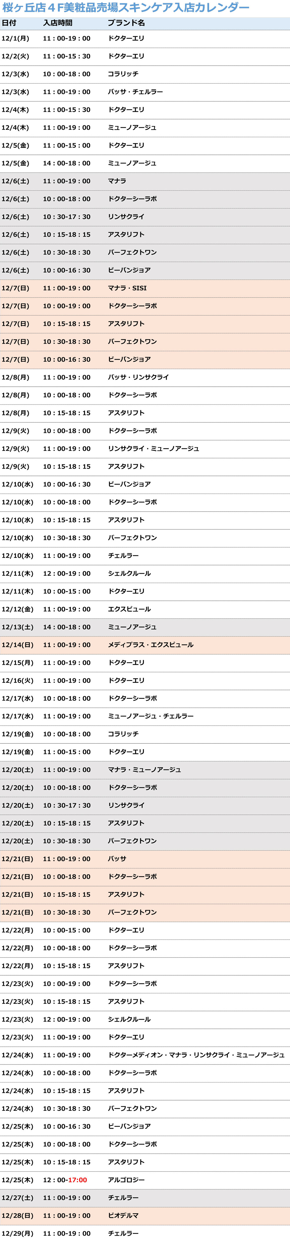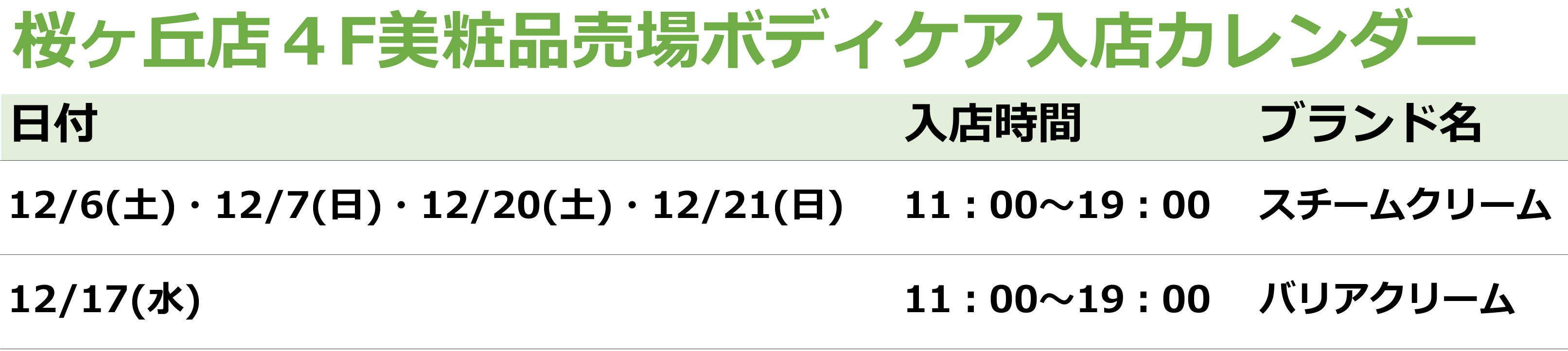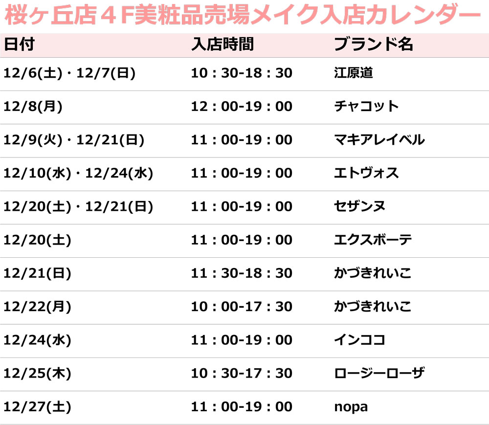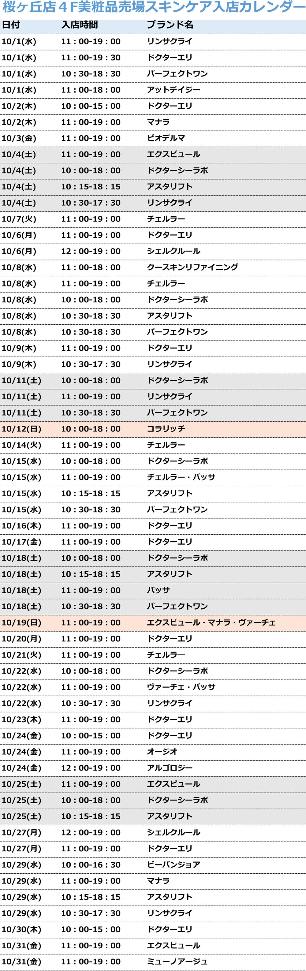 聖蹟桜ヶ丘店美粧品売場 専門スタッフ入店カレンダー