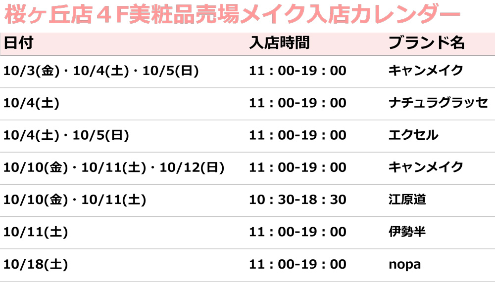 ※10/3~10/5のキャンメイクは入店時間を修正いたしました。10/10~10/12のキャンメイク入店を追加いたしました。(10/6修正)